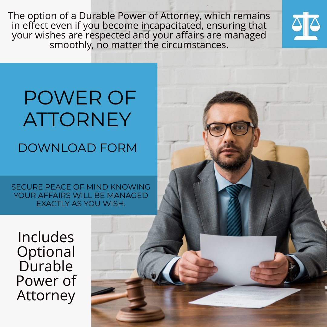 Additionally, we include the option of a Durable Power of Attorney, which remains in effect even if you become incapacitated, ensuring that your wishes are respected and your affairs are managed smoothly, no matter the circumstances. Secure your future and maintain control over your decisions with our comprehensive Power of Attorney services, including the durable option for added peace of mind.